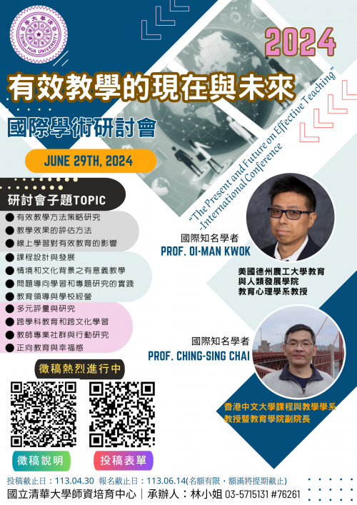 一、依據國立清華大學113年2月29日清師培字第1139001582號函辦理。 二、旨揭國際學術研討會以「有效教學的現在與未來」為主軸,透過國際知名專家學者、國內教育學者及教學實務工作者的發表與分享,探討提升教學效能之學術理論與實務經驗,增進教育工作者之專業成長,共同探討如何提高教學的品質,以應對不斷變化的需求。 三、研討會相關資訊如下: (一)日期及時間:113年6月29日(星期六)08:50-16:00。 (二)地點:國立清華大學南大校區(新竹市南大路521號)。 (三)研討方式:國內外知名學者專題演講、論文發表(口頭或海報)。 (四)投稿重要時程: 1.投稿摘要截稿日期:113年4月30日(星期二)止。 2.通知審稿結果日期:113年5月20日(星期一)前。 3.全文繳交日期:113年6月10日(星期二)止。 (五)徵稿資訊:https://reurl.cc/qr4o1R。 (六)投稿專用Google表單連結:https://reurl.cc/Xqaogj。 四、與會者參加研討會報名:即日起至113年6月14日前於Google報名表單填報,表單連結如下:https://reurl.cc/mrkg1Y。 五、本次研討會重要相關訊息更新請參閱本校師培中心官方網頁。 六、檢附旨揭研討會海報電子檔1份。