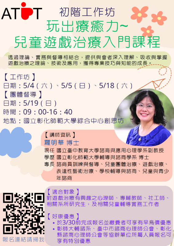轉知台灣遊戲治療學會將於113年5月4、5、18、19日舉辦【初階工作坊】~玩出療癒力~兒童遊戲治療入門課程