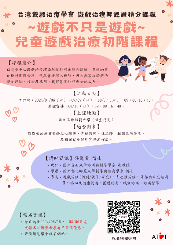 轉知台灣遊戲治療學會將於113年7月6、7日及8月17、18日舉辦2024台灣遊戲治療師認證積分課程『遊戲不只是遊戲』兒童遊戲治療入門課程