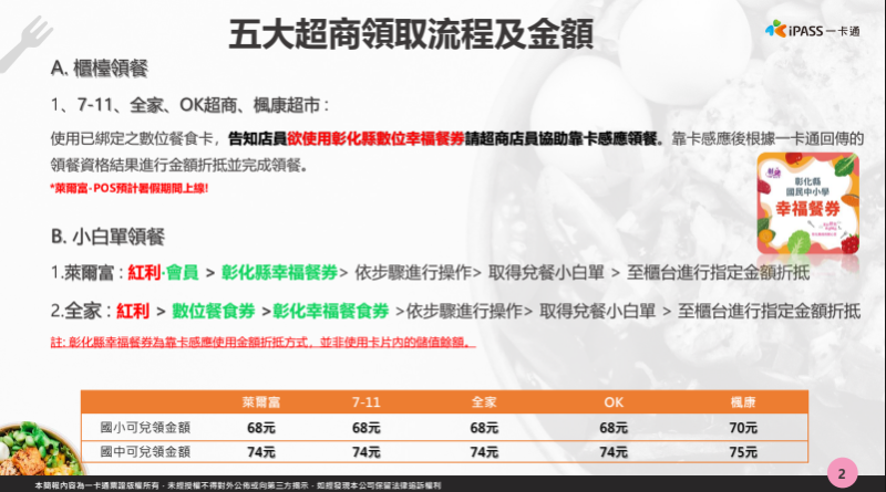 重要通知: 1.兌餐日期: (一) 國小在校生:113年6月29日至8月29日止。 (二) 國小6年級畢業生:畢業典禮當日至113年8月29日止。 2.一日一餐,領餐資格限當日 23:59 前領取完畢,超過期限沒有補領機制。 3.合作商店:統一(7-11)、全家、萊爾富、OK 超商及楓康超市。 4.領餐超商全國門市皆可以持數位學生證進行兌餐使用,不侷限於彰化縣地區。 5.卡片裡並【無金額】,能領餐是因為【卡片裡學校登錄賦予的資格】。(注意:一卡通功能有交易、儲值、乘車等功能,但請半年內先勿儲值) 6.若暑假期間卡片遺失,仍可手輸卡號、學號進行領餐,但須支付工本費完成卡片補發,因卡片將作為數位學生證使用,請同學務必妥善保管。 卡片掛失使用既有停卡掛失系統。 7.學生卡片遺失忘記卡號可請查看父母的親師生APP(彰化校園e指通),上面的餐食模組就可以查看卡號學號。
