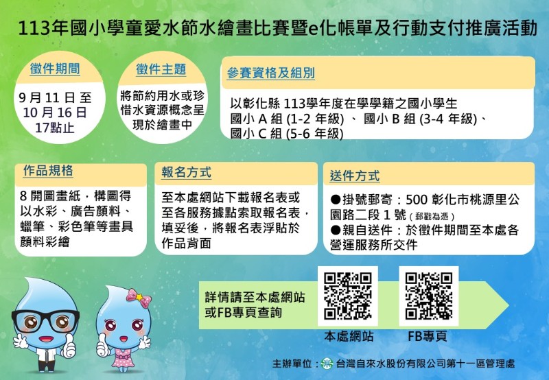 轉知台灣自來水股份有限公司第十一區管理處113年彰化縣國小學童愛水節水繪畫比賽暨e化帳單及行動支付推廣活動簡章、報名表各1份 |