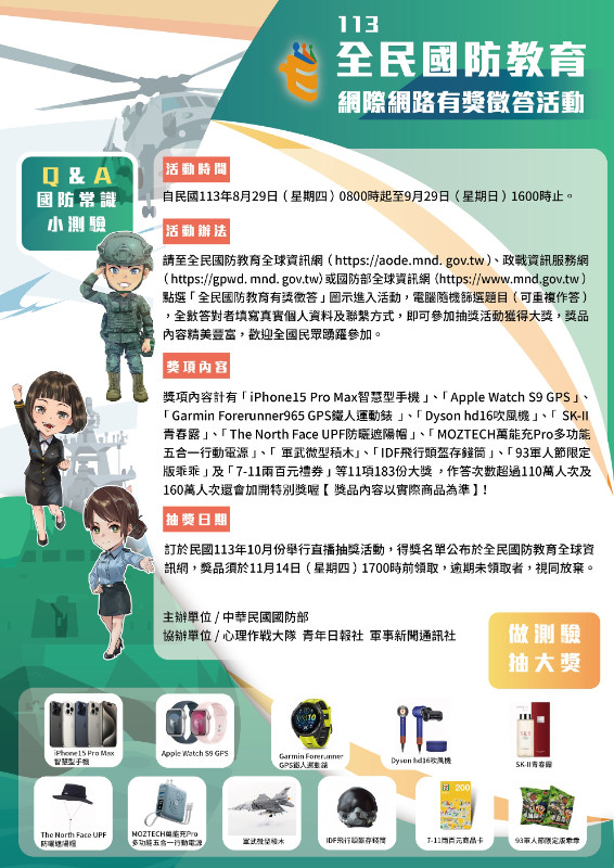 主旨:函轉國防部民國113年全民國防教育「網際網路有獎徵答活動」實施計畫,並鼓勵所屬踴躍參加,請查照。說明:依據國防部113年9月2日國政文心字第11302371301號辦理。