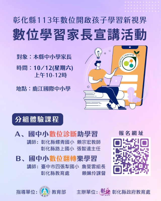 一、依據教育部核定「推動中小學數位學習精進方案」113年中小學實施計畫辦理。 二、為協助縣內中小學家長了解數位學習推動現況,與孩子一同迎向數位學習新時代,爰辦理因材網平臺家長體驗活動,推廣新型態教學的變化。 三、活動資訊: (一)活動名稱:113年數位開啟孩子學習新視界—數位學習家長宣講活動。 (二)辦理單位:教育部、彰化縣政府教育處。 (三)活動時間:113年10月12日(星期六)上午10時至12時。 (四)活動地點:鹿江國際中小學圖書館(彰化縣鹿港鎮自由路300號)。 (五)參加對象:彰化縣中小學家長,限額 60 名。 (六)報名方式:以線上表單方式報名(https://forms.gle/rewKBgCd5oC4R4Ur9),即日起至額滿為止。 四、當天09:00-12:00於學校活動中心亦辦理本縣數位教育創新成果發表會,歡迎各校家長共襄盛舉。 五、如有未盡事宜,請逕洽本縣數位學習推動辦公室04-7237182#20。