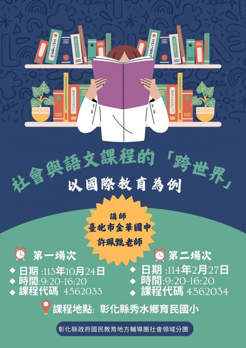 一、依據本縣113學年度精進國民中學及國民小學教師教學專業與課程品質計畫辦理。 二、辦理日期及地點: (一)第一場次時間:113年10月24日9:20~16:20(課程代碼: 4562033)。 (二)第二場次時間:114年2月27日9:20~16:20(課程代碼: 4562034)。 (三)地點: 彰化縣秀水鄉育民國小(彰化縣秀水鄉下崙村民生街 262 號) 三、旨揭計畫參與對象為本縣國中小社會領域與國語文領域授課教師、國教輔導團社會領域分團成員,每場次各40名。請各校惠予所有參加研習人員公(差)假,課務派代全程參與者,核予研習時數每場次6小時。此研習為延續性之實作工作坊,報名參與者請兩場次全程參與,勿於中途更換人員。 四、歡迎參與老師加入彰化縣社會領域國中小教師共備群組-悠遊伴縣社會團,以利討論。共備群組連結http://gg.gg/1by0xw 五、本案承辦人: 社會領域聯絡人蘇鈴涵教師(聯絡電話:04-7694845#819 )。