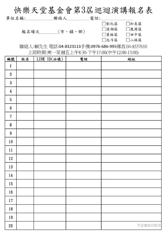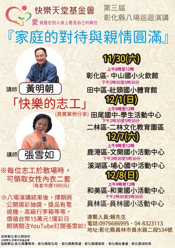 轉知財團法人彰化縣私立快樂天堂社會福利慈善事業基金會辦理113年度彰化縣第3屆快樂的志工巡迴演講