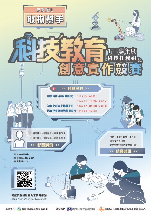 一、依據國立科學工藝博物館113年11月25日館教字第1136263536號函辦理。 二、本競賽係由教育國民及學前教育署主辦,由該館與國立高雄師範大學共同承辦之全國性競賽,邀請全國國中及國小學生參與,將科技領域習得之相關知識與技能發揮於競賽中,參賽團隊可跨校組隊,優勝者將獲頒教育部國民及學前教育署獎狀。 三、本競賽限網路報名,報名時間自113年12月1日至114年1月16日(週四)下午5時止,詳細競賽資訊可參閱網頁:https://tech.k12ea.gov.tw/contest/。 四、檢附競賽電子海報1份。