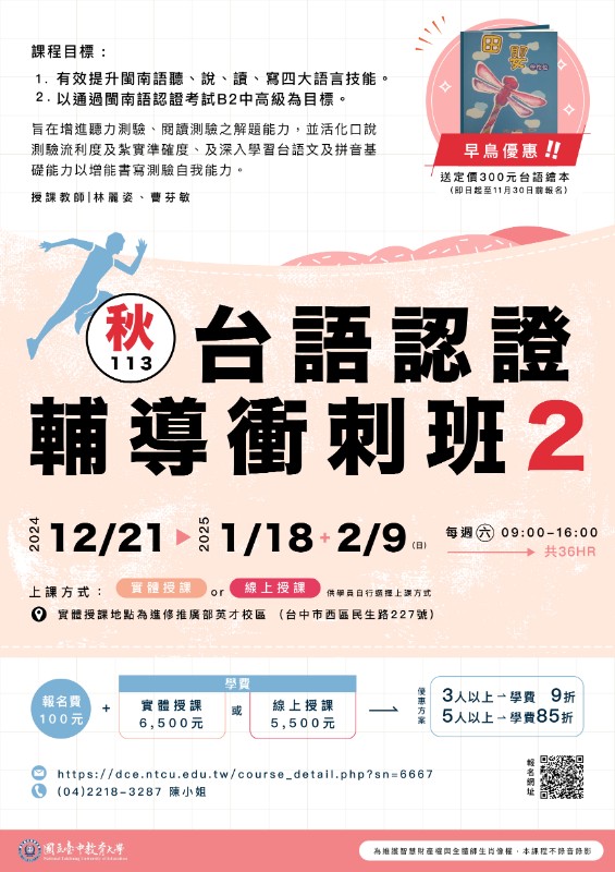 上課費用:6500元。早鳥優惠-即日起至11月30日前報名,送定價300元台語繪本。 |