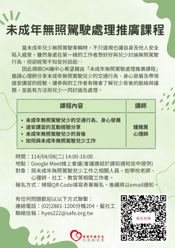 轉知:財團法人靖娟兒童安全文教基金會OK繃兒童服務中心辦理114年度「未成年無照駕駛處理推廣課程」 |