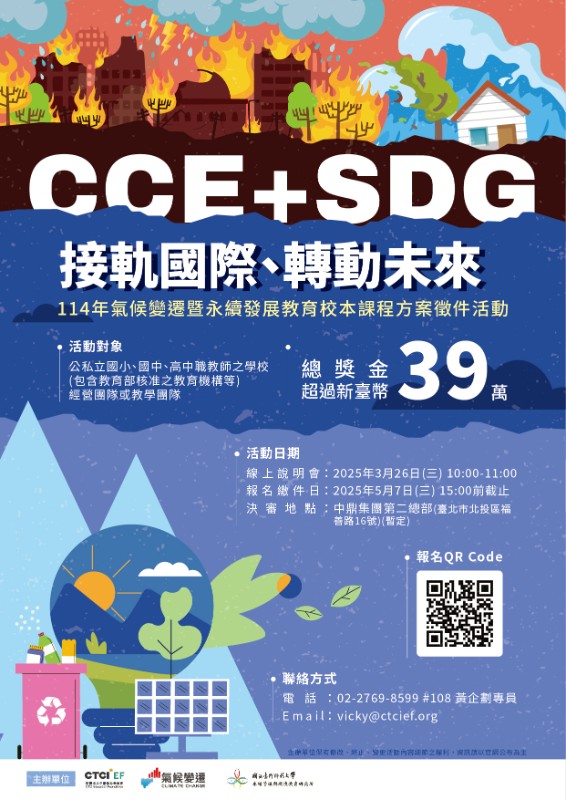 | 一、為強化我國各級教育人員對於氣候變遷教育(CCE, climate change education)、永續發展教育(ESD, education for sustainable development)與聯合國永續發展目標(SDGs)的認識,響應我國《氣候變遷因應法》對於氣候變遷教育的重新定位,與賴總統於國家氣候變遷對策委員會第三次會議之指示(https://www.president.gov.tw/News/39011),朝向「氣候變遷暨永續發展教育」(CCESD=CCE+ESD) 國際趨勢邁進,連結永續發展目標(SDGs)後,成為CCESDG。中鼎教育基金會(CTCIEF) 特與教育部氣候變遷教學資訊平臺氣候變遷教育推動計畫、國立臺灣師範大學永續管理與環境教育研究所共同籌辦旨揭徵件活動,以鼓勵教師研發「氣候變遷暨永續發展教案」。 |