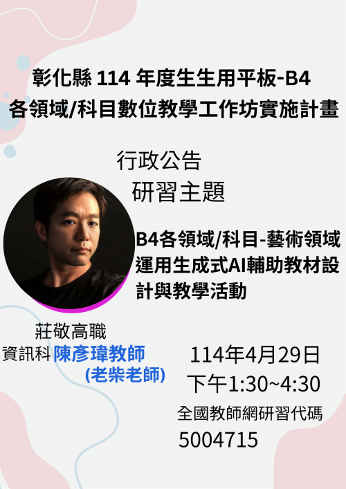 | 標題 | 彰化縣 114 年度生生用平板 -「B4各領域/科目-藝術領域 運用生成式AI輔助教材設計與教學活動」研習 |