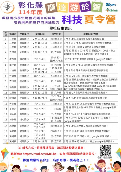 一、為向下扎根本縣國小學童之科技力,啟發其對程式語言之興趣,並培養未來世界之溝通能力,由本縣廣達游於智種子學校辦理科技夏令營。營隊課程採用為國小學童量身打造之程式教具Quno與Qblock,協助學生學習未來最具通用性的語言,輕鬆有趣地打開通往元宇宙的大門,期使本縣學子度過充實且富有意義的暑假生活。 二、本營隊招生對象為本縣國小三至六年級學生(實際依各校招生簡章公告為準)。 三、活動時間為114年7月至8月,報名方式、課程表及相關資訊詳見各校招生簡章(網址:https://reurl.cc/AMzLbe)。如有疑問,請逕洽各主辦學校。 四、敬請貴校協助公告並轉知學生踴躍報名,名額有限,額滿為止。 |
