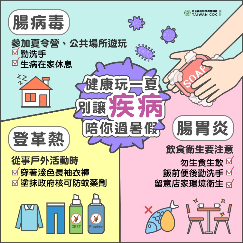 有關登革熱防疫等相關資訊,請逕至衛生福利部疾病管制署全球資訊網(http://www.cdc.gov.tw)查閱或下載運用;或撥免付費防疫專線1922(或0800-001922)洽詢。 |
