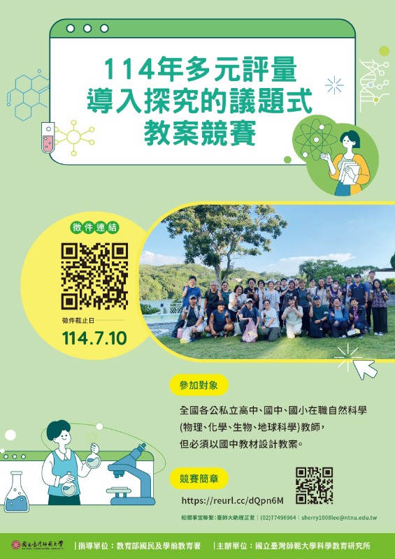 有關國立臺灣師範大學辦理「114年多元評量導入探究的議題式教案競賽」徵稿一案 |