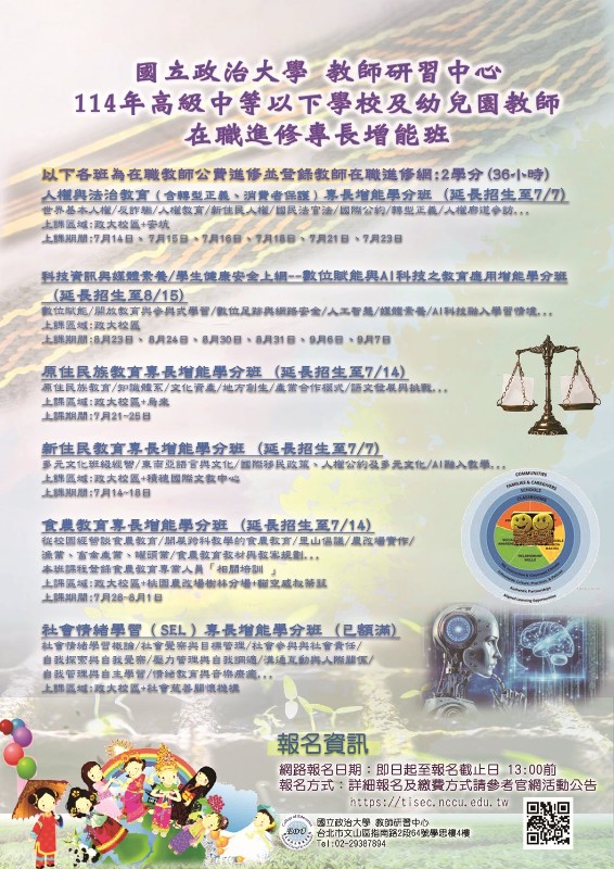 | 標題 | 檢送國立政治大學教師研習中心執行教育部補助辦理「114年度高級中等以下學校教師在職進修專長增能學分班」簡章(如附件) |
