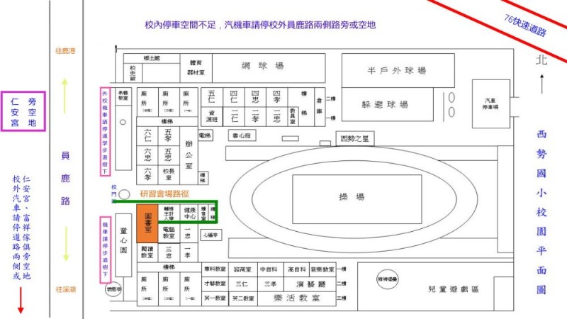 一、 依據本縣114學年度精進國民中小學教師教學專業與課程品質整體推動計畫辦理。 二、研習相關資訊: (一)時間:115年3月18日(三)上午9時至12時40分。 (二)地點:西勢國小圖書館 (彰化縣福興鄉西勢村員鹿路二段412號) (三)對象:本縣生活課程教師、生活課程召集人與輔導團員,亦歡迎對音樂律動教學感興趣之教師前來共襄盛舉。 (四)參加人員請至全國教師在職進修網報名,凡全程參加各場次研習之教師核予3小時研習時數。(研習代碼:5430171)。 三、研習時為落實環保,請自備飲水容器、環保筷。 四、檢附實施計畫及停車示意圖各1份。 五、【注意】西勢國小校內停車空間不足,汽機車請停校外員鹿路兩側路旁或空地(如停車示意圖)。 六、連絡人:西勢國小葉美萱老師777-2317#226。