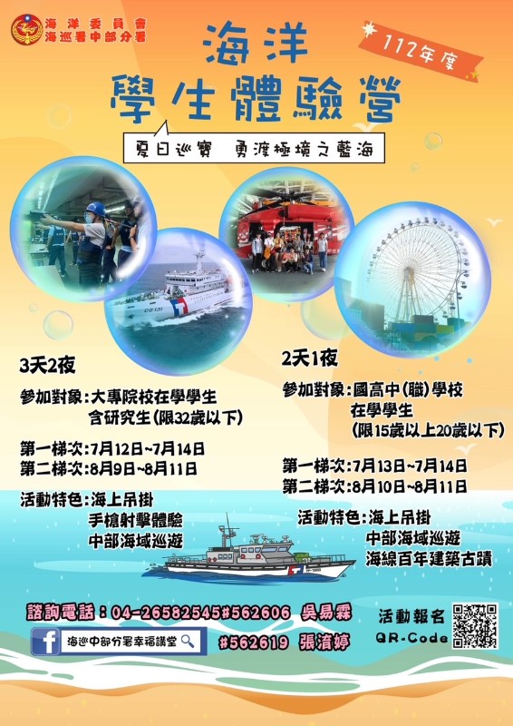 轉知 海洋委員會海巡署中部分署辦理「海洋委員會112年海洋學生體驗營-夏日巡寶、勇渡極境之藍海」,請鼓勵所屬員工子弟(大專院校及國高中職在學學生)踴躍報名參加 |