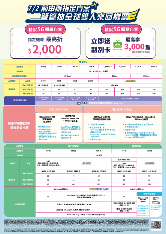 方案特點:本次畢業大禮包方案分為精采5G購機方案及4G |