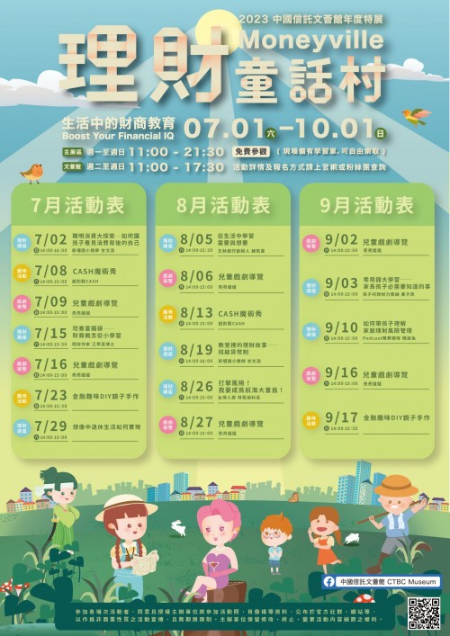 一、依據中國信託112年6月16日中信銀字第1122003478號函辦理。 二、為推廣理財觀念與生活化金融知識,文薈館每年推出寓教於樂的金融教育主題展覽,以金融專業支援學校教育課程、戶外教學或團體(20人以上)參訪,文薈館可於平日安排專人導覽包含特展及文薈館體驗。週末假日舉辦親子理財講座、戲劇導覽、DIY手作課程與魔術秀等,提供師生及親子共學共玩。 三、文薈館為中國信託成立之非營利金融文史館,免費對外開放,期能普及金融教育並善盡企業社會責任。(現場備有學習單,可自由索取。) 四、旨揭特展資訊如下: (一)展覽時間:112年7月1至 10月1。 (二)展覽區: 1.特展區:週一至週日,11:00至21:30。 2.文薈館展區:週二至週,11:00至17:30。 (三)展覽地點:中國信託金融園區文薈館(臺北市南港區經貿二路168號A棟1樓)。 (四)展覽簡介:打造繪本故事風格的展場,探討生活中可能會遇到的金融問題及應該如何因應。 展區依「存款與緊急預備金、錢從哪裡來? 認識金融機 構」、「目標儲蓄與消費、需要與想要、記帳」、「支付 方式、投資理財與風險」、「比價節流、借貸、斜槓開源」、「生活中必要的保險」等五個主題,切入貼近生活的財商觀念,以簡單有趣互動探索及闖關學習單,引導思 考學習財商小常識、理財觀念。凡於特展期間完成指定任務者,不只可獲得限定精美小禮,還有機會抽中Switch大獎。 五、本展資訊,請貴校轉知相關訊息並鼓勵作為校外教學參考之依據。 六、檢附展覽海報及活動表各1份。