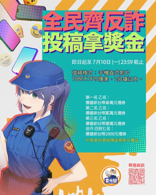 活動名稱:「全民齊反詐 投稿拿獎金」反詐短影音徵稿活動 活動方式:針對六大詐騙手法「假網拍、假投資、解除分期付款、假檢警、假交友及猜猜我是誰」,徵求反詐短影音創作,向大眾宣導如何識詐、阻詐等,共同參與、一齊反詐! 徵稿短影音規格:1080×1920像素,「直式」影片,2分鐘以內。 活動期程: 一、收件期間:自即日起收件,至112年7月10日24時截止。 二、結果公布:活動結束一週內公布得獎名單。 收件方式: 填寫表單https://reurl.cc/655n5b,並在表單中上傳作品雲端連結以及活動報名表及同意書供下載。 獎項如下: 第一名:價值新臺幣3萬元禮劵。 第二名:價值新臺幣2萬元禮劵。 第三名:價值新臺幣1萬元禮劵。 佳作4-7名:價值新臺幣2,000元禮劵。 所有參加者:致贈精美小禮。