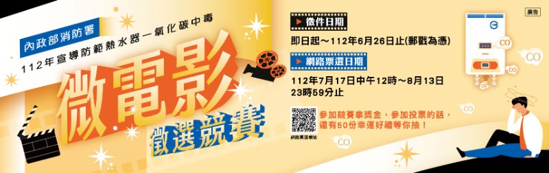 轉知 「112年宣導防範熱水器一氧化碳中毒微電影徵選競賽」橫幅廣告及宣傳圖卡各1份
