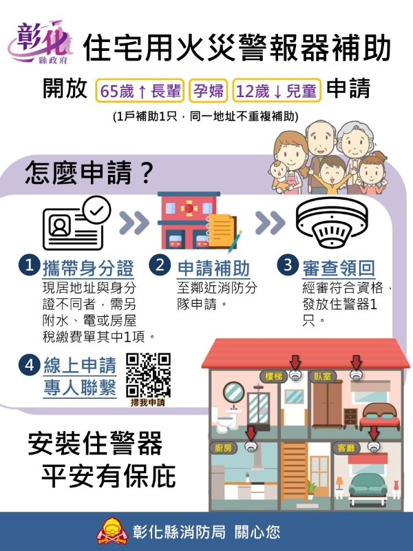 彰化縣106年迄今已有52件住宅用火災警報器成功示警案例,於災時示警民眾,使民眾及早發現、及早反應、及時進行避難逃生,有效降低火災致災率,而為擴大推廣成效,彰化縣消防局於今年起開放「家有12歲以下兒童者」申請補助(1戶補助1只,同一地址不重複補助),並同步建置線上申請系統(網址:https://reurl.cc/R6633z),鼓勵民眾把握機會踴躍申請。