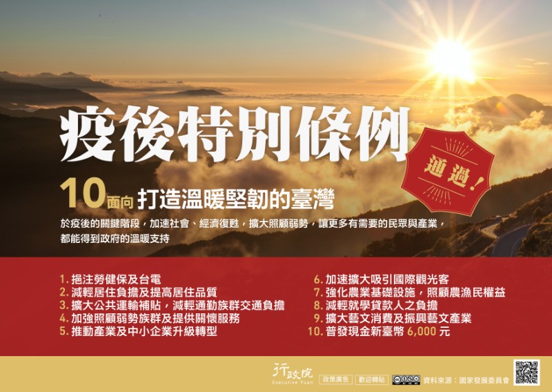為加速疫後復甦,《疫後強化經濟與社會韌性及全民共享經濟成果特別條例》於112年2月21日經立法院三讀通過,其特別預算案刻正立院審議中,俟通過後,讓國人與產業獲得政府溫暖支持。行政院特策製旨揭說明資料