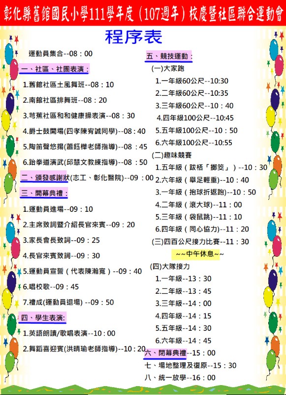 舊館國小111學年度(107週年)校慶暨社區聯合運動會,敬邀各界貴賓蒞臨指導。