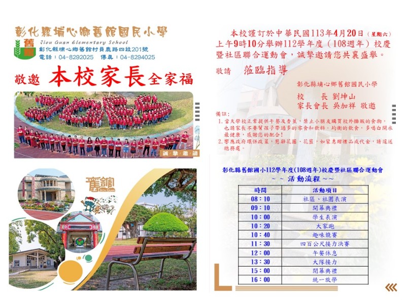 本校謹訂於中華民國113年4月20日(星期六)上午9時10分舉辦112學年度(108週年)校慶暨社區聯合運動會, 我們誠摯邀請您共襄盛舉,敬請 蒞臨指導 彰化縣埔心鄉舊館國民小學 校 長 劉坤山 家 長 會 長 吳加祥 敬邀 備註:1.當天學校正常提供午餐及香蕉,禁止小朋友購買校外攤販的食物,也請家長不要幫孩子帶過多的零食和飲料。均衡的飲食,多喝白開水最健康,感謝您的配合! 2.響應環保政策,懇辭花圈、花籃,如蒙惠贈禮品或代金,請逕送總務處。 |