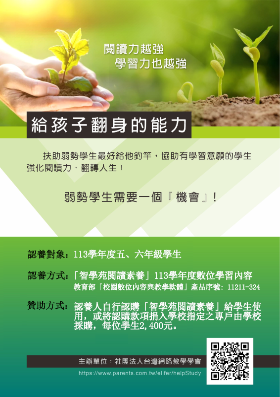 本會辦理113學年度「弱勢學生拔尖助學媒合方案」,提供弱勢學生免費使用「智學苑閱讀素養」(教育部「校園數位內容與教學軟體」產品序號: 11211-324),敬請貴校師長協助弱勢學生線上提出申請。 |