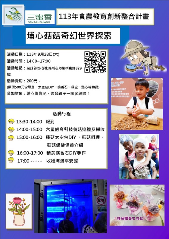 | 標題 | 埔心鄉農會辦理113年度食農教育創新整合計畫-「埔心菇菇奇幻 世界探索」食農教育推廣活動,歡迎踴躍報名。 |