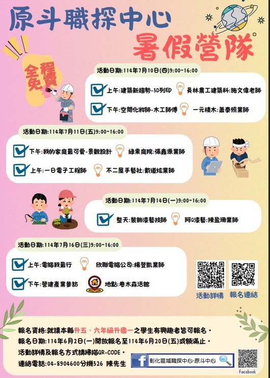 「彰化縣國民中學區職業試探與體驗示範中心-原斗中心」113學年度暑假營隊課程,歡迎學生報名參加。 |