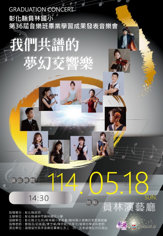 | 標題 | 員林國民小學於114年5月18日(星期日)舉辦「第36屆音樂班畢業學習成果發表音樂會」鼓勵學生踴躍參加 | |||