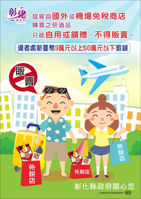 提供電子字幕跑馬燈訊息內容:「旅客自國外或機場免稅商店購買之菸酒品,只能自用或饋贈,不得販賣,違者處新臺幣3萬元以上50萬元以下罰鍰。」,歡迎多加利用。