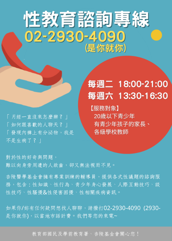 | 標題 | 轉知:杏陵醫學基金會「109學年度校園性教育(含愛滋病防治)計畫」之「性教育電話諮詢專線」 |