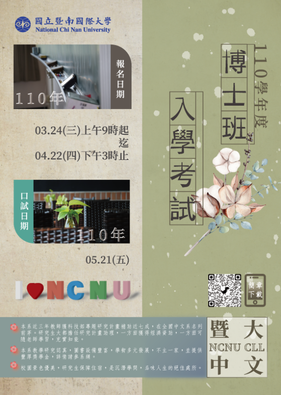 | 標題 | 轉知:國立暨南國際大學中國語文學系110學年度博士班入學考試即將開始報名,檢送招生海報電子檔 |