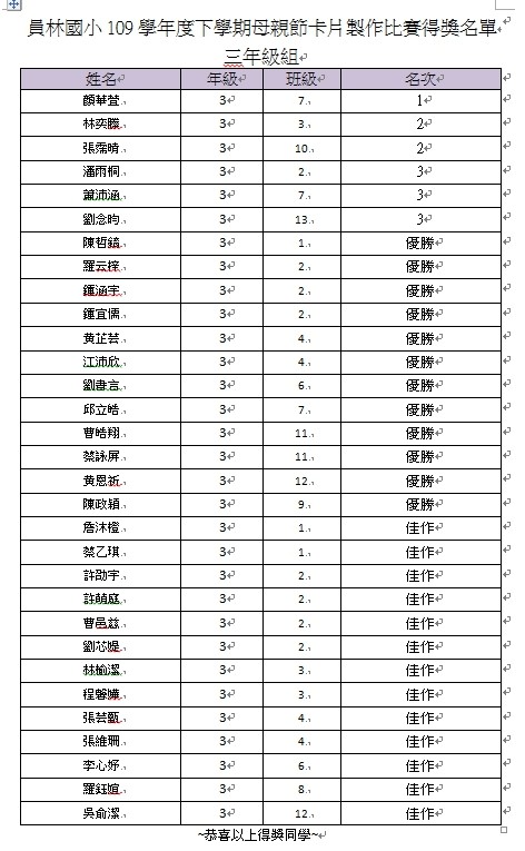 | 標題 | 109學年度下學期母親節卡片製作比賽得獎名單及優秀作品公告 |