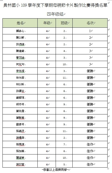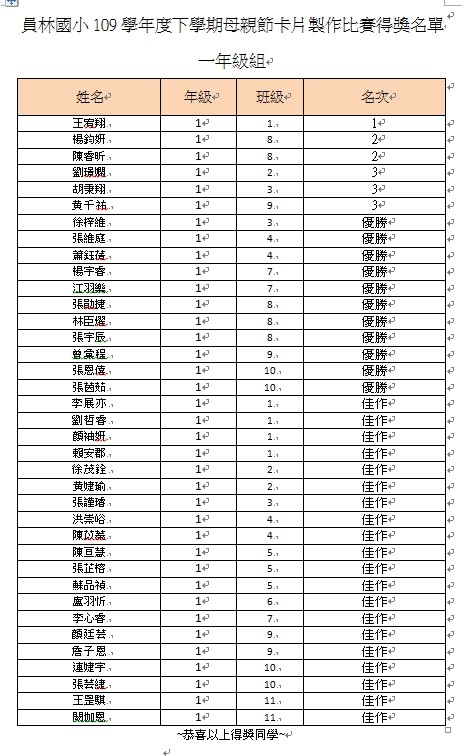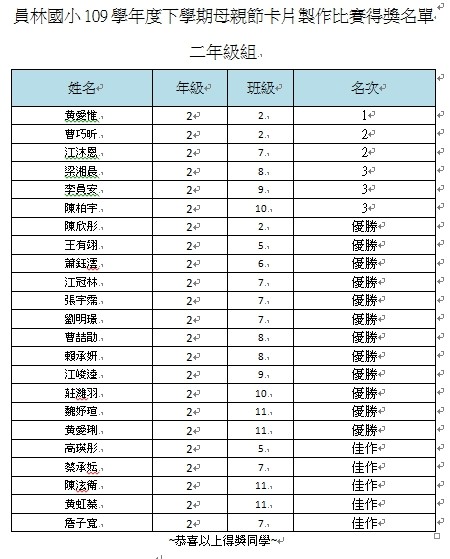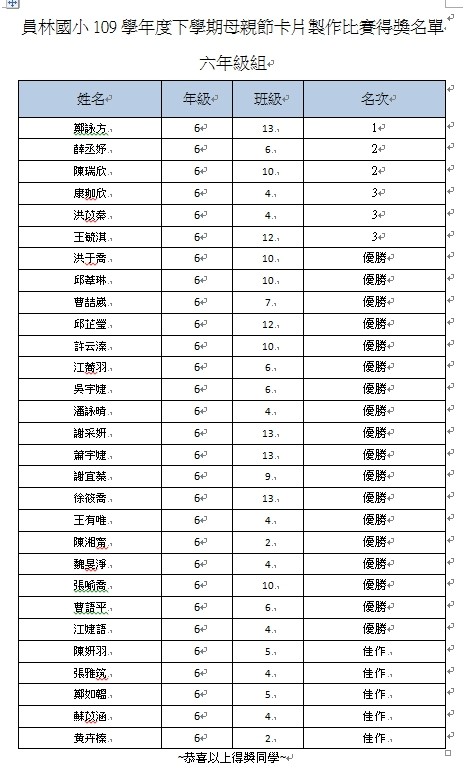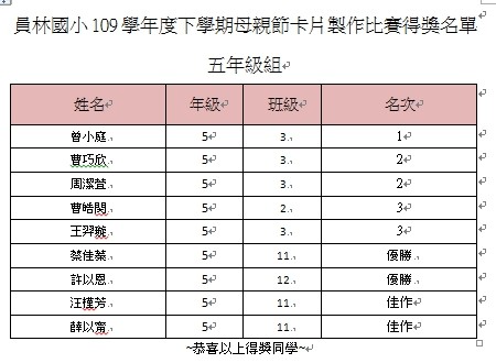 2.得獎作品請接點選各年級連結 109學年度員林國小母親節卡片得獎作品 5五年級作品. 4年級作品. 3年級作品. 2年級作品. 1年級作品.