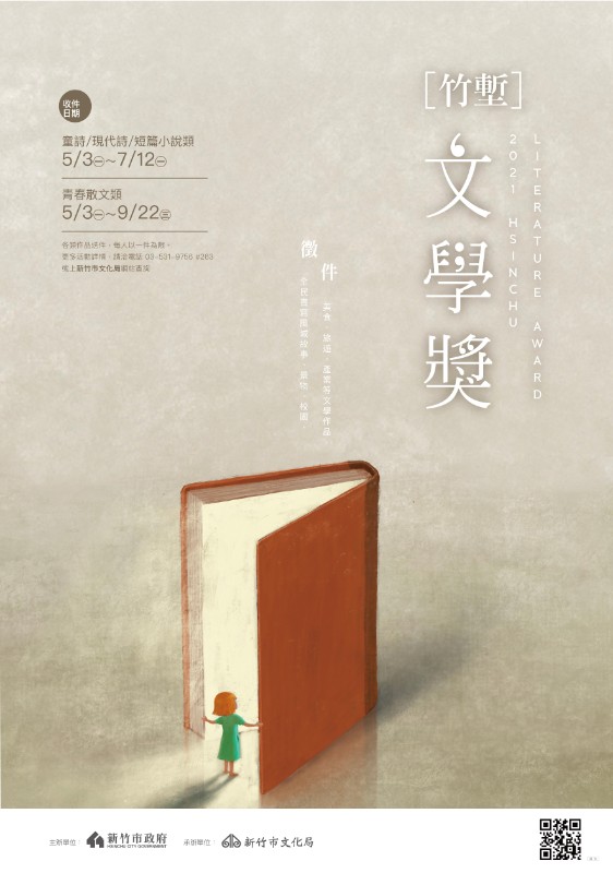 一、依據新竹市文化局110年4月29日竹市文資字第1100003343號函辦理。二、2021竹塹文學獎徵件鼓勵全國民眾書寫風城故事,獎項共徵選4類文類,依徵文對象,可區分為:(一)童詩:限國小六年級以下學童創作投稿。(二)青春散文:徵選國、高中(職)學生創作投稿。(三)現代詩及青春散文:不限年齡資格創作投稿。三、徵文收件日期自即日起至110年7月12日(星期一)止,惟青春散文類延長至9月22日(星期三)截止投稿。四、得獎作品最高獎金新臺幣10萬元整,學校教師指導學生投稿即可贈書(送完為止)。五、詳細活動資訊及簡章內容請至新竹市文化局網站:https://culture.hccg.gov.tw/業務項目/竹塹文學獎/公告下載,歡迎下載利用。