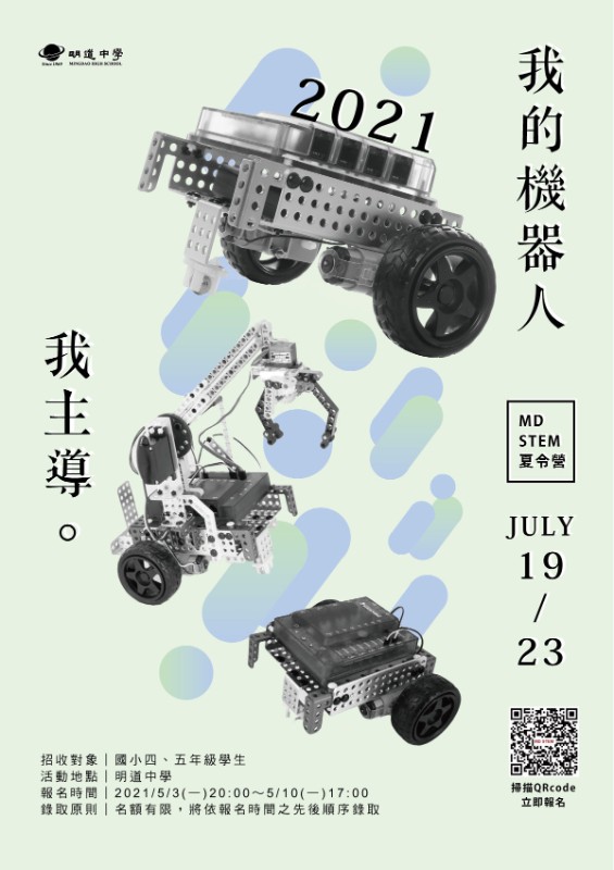 一、活動時間:110年7月19日(一)~23日(五)共五天。二、參加對象:限國小四、五年級學生(今年暑假前)。三、報名方式:線上報名,網址:https://sites.google.com/view/2021mdstem/。四、報名時間:5月3日(一)20:00~5月10日(五)17:00。五、聯絡電話:04-23341186、04-23341736。