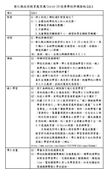 彰化縣政府教育處因應Covid-19疫情學校停課措施Q&A 詳如附件