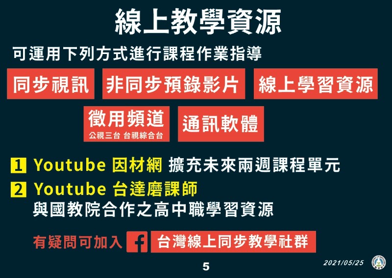 標題:因應教育部110年5月25日新聞稿,全國各級學校因應疫情延長停止到校上課採居家線上學習時間至110年6月14日止,請配合相關防疫措施。