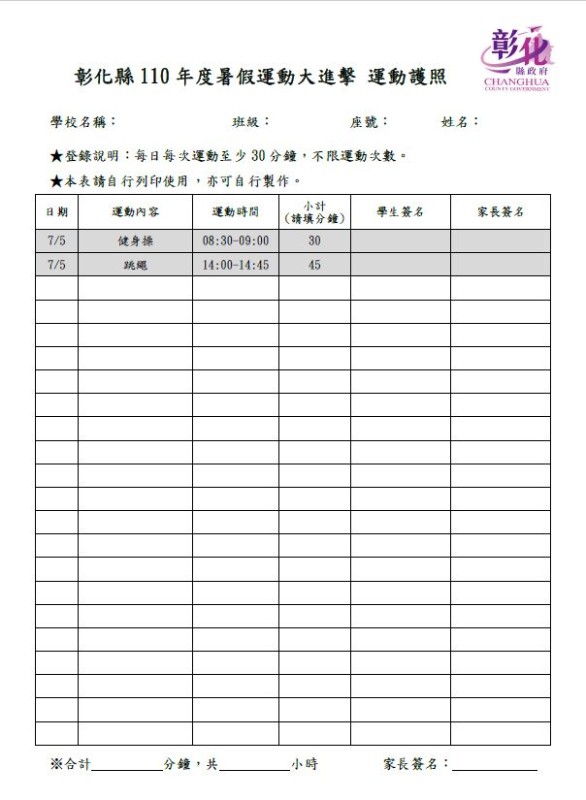| 標題 | 「彰化縣110年度暑假運動大進擊實施計畫」 |