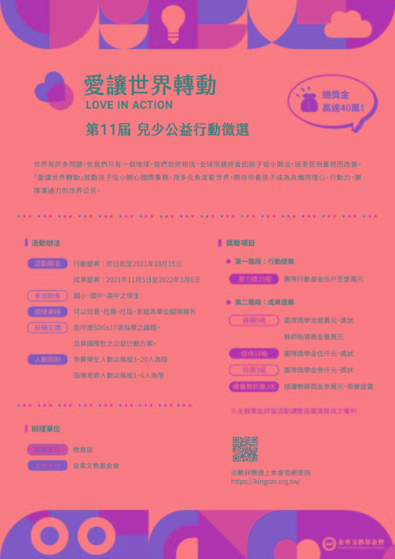 一、本會自2011年開始舉辦「愛讓世界轉動 兒少公益行動」徵選,多年來累積超過萬名來自全台各地師生踴躍參與,以STAGE行動步驟讓孩子走進世界舞台,學習發現問題、付諸行動、發揮愛心並能收穫成長。 (1)「行動提案」:潛力獎15組/行動基金5,000~10,000元。