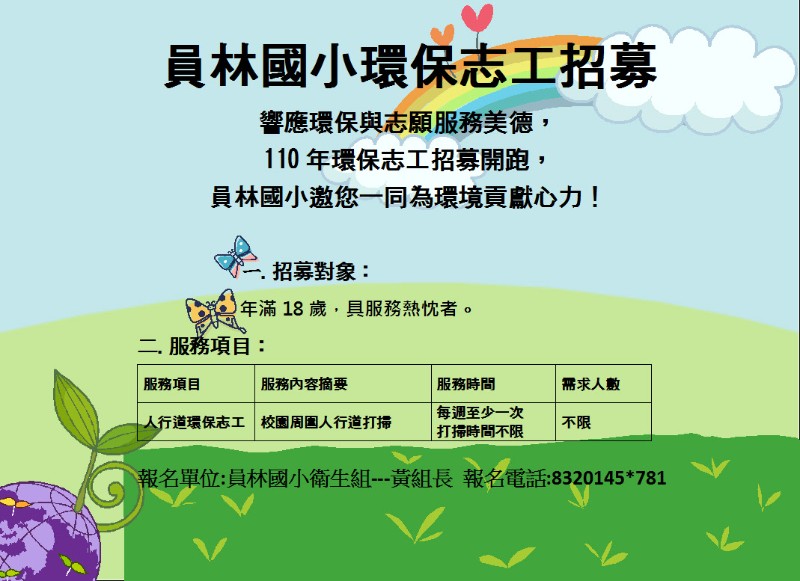 員林國小環保志工招募- 響應環保與志願服務美德, 110年環保志工招募開跑, 員林國小邀請您一同為環境貢獻心力!