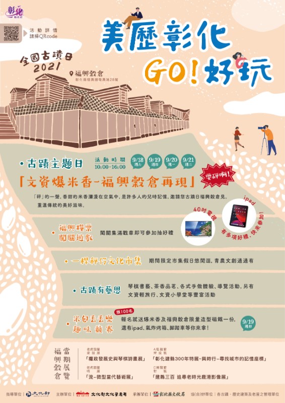 (二)活動地點:彰化縣歷史建築福興穀倉(彰化縣福興鄉復興路28號)。 (三)活動內容:「米包丟丟樂」趣味競賽(參加者均致贈爆米香及限量造型磁鐵乙份、前十名有機會獲得ipad 、高級氣炸鍋、腳踏車等獎品)、「福興糧票闖關遊戲」(闖關集滿戳章可參加抽好禮)、「古蹟有藝思」琴棋書藝茶香品茗、各式手作體驗導覽活動、「一桿秤仔文化市集」-文創手作及青農市集、文資美術力「流-微型當代藝術展」、老虎窗常設展-鹿港風雅-琴棋詩書畫、彰化建縣300年特展追尋老時光-鹿港影像展、與時行-尋找城市的記憶座標等活動。