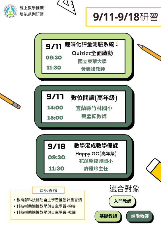 一、依據國立東華大學110年9月13日東教潛字第1100017041號函辦理。 二、受疫情影響,為使校內教師了解線上教學的授課方式,爰辦理旨揭教師研習。 三、研習課程皆採線上方式辦理,研習日期時間及報名方式如下,其餘資訊請參閱附件活動海報。 (一) 趣味化評量測驗系統—Quizizz全面啟動 研習時間:110年9月11日 上午9時30分至11時30分 報名方式:全國教師進修網,課程代碼:3196033。 (二) 數位閱讀 研習時間:110年9月17日 下午14時至15時 報名方式:全國教師進修網,課程代碼:3198396。 (三) 數學混成教學備課Happy GO 研習時間:110年9月18日 上午9時30分至11時30分 報名方式:全國教師進修網,課程代碼:3198397。