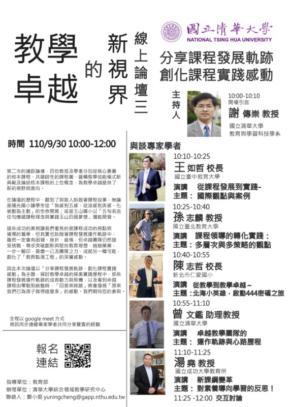 一、依據國立清華大學110年9月16日清師培字第1109006019號函辦理。 二、本次論壇探討教學卓越的探索實踐歷程中,那些課程發展運作軌跡的成長動力與契機,以及看到卓越課程由零散到統整時,「回首來時路」將會發現「原來我們已為孩子做得這麼多」的感動。 三、論壇主持人:謝傳崇教授。與談人:王如哲校長、孫志麟教授、陳志哲校長、曾文鑑助理教授、湯堯教授。 四、報名方式:請於9月30日前報名,因人數有限,錄取方式以報名先後為準。報名連結如下: https://forms.gle/ZLrVtkLr1fgZRhUG8 五、舉辦方式:本論壇全程採用線上方式(Google Meet)進行,完成報名來賓將於論壇前二日(9月28日前)收到論壇連線代碼。 六、檢附論壇海報一份。