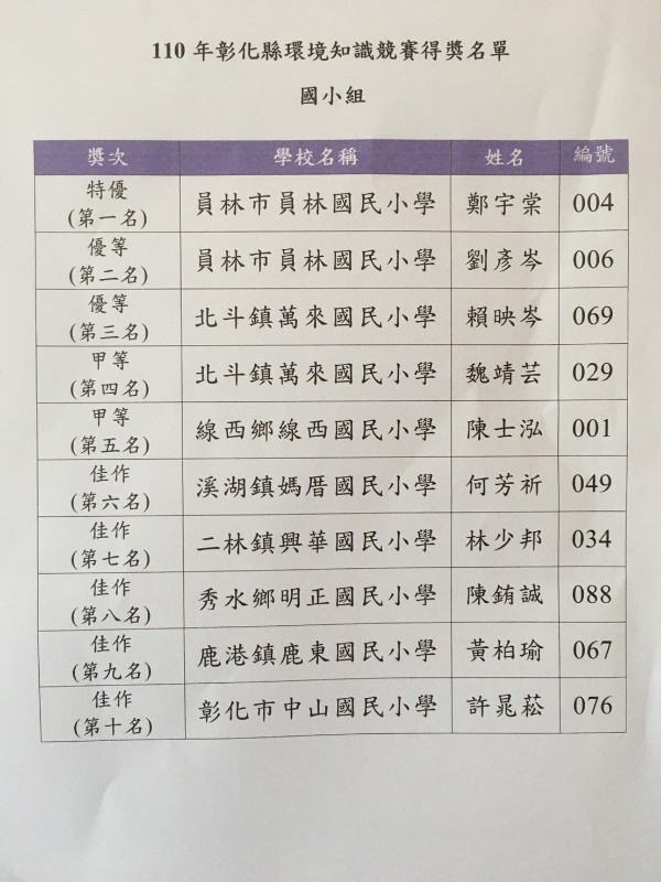 恭賀:陳威銓老師指導505鄭宇棠 .劉彥岑兩位同學參加彰化縣110年環境知識競賽,成績優異分別榮獲國小組第一名.第二名佳績,同時取得代表彰化縣參加環境知識全國賽資格。