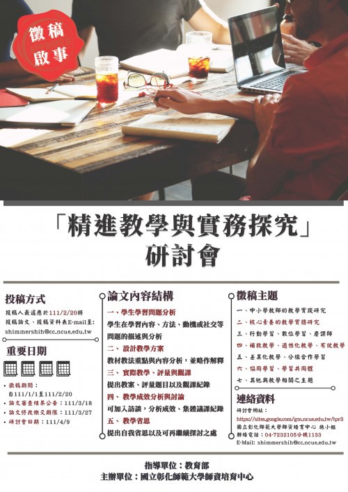| 標題 | 轉知:國立彰化師範大學師資培育中心辦理精進教學與實務探究研討會徵稿啟事 |