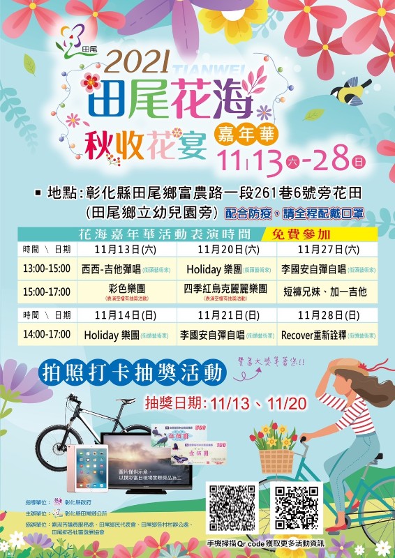 一、活動內容:美麗花海免費開放參觀,現場另有音樂表演、摸彩活動、親子遊戲氣墊迷宮等多項豐富內容(詳細內容請參考附件活動電子海報)。二、花海展示期間:110年11月13日(星期六)至110年11月28日(星期日)。三、活動地點:彰化縣田尾鄉富農路一段261巷6號旁花田(田尾鄉立幼兒園旁)。